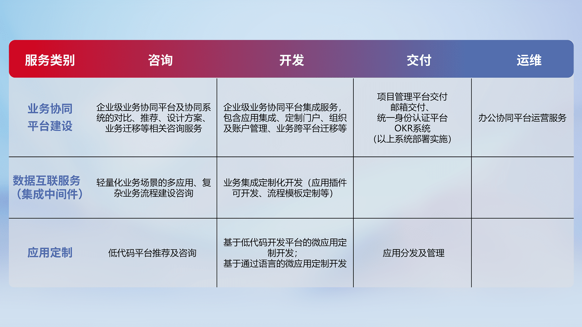 针对钉钉、、企微、、、IDaas等平台级产品提供产品的规划、、、、方案、、交付、、、定制化开发等服务,,,,实现如统一协同办公、、智能客户服务、、、、混合会议管理、、、智能数据查询、、等业务场景,,,实现数字化转型。。。。